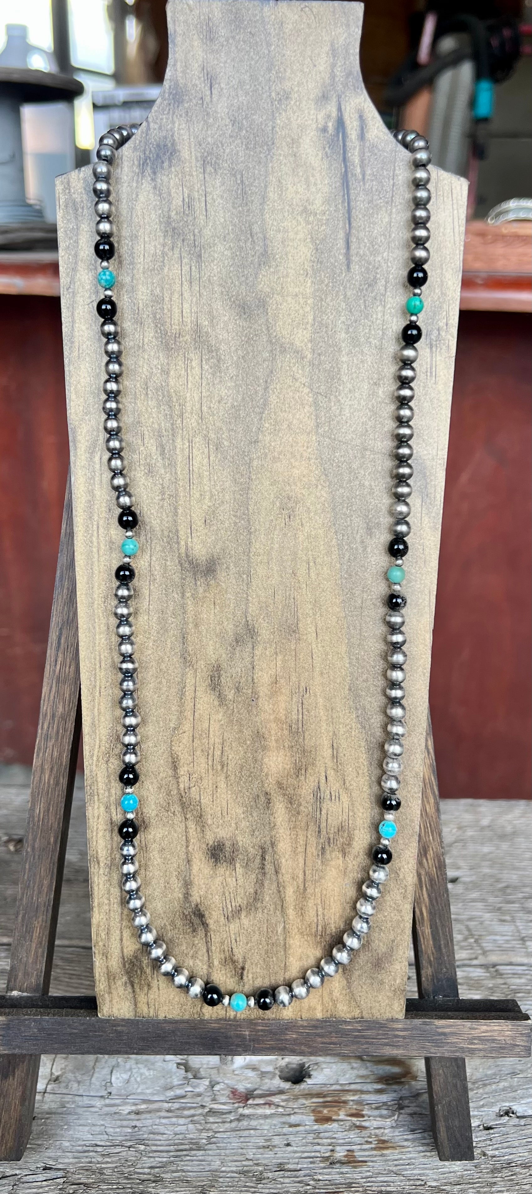 Black Onyx, Kingman turquoise, 6mm sterling silver Pearl Necklace