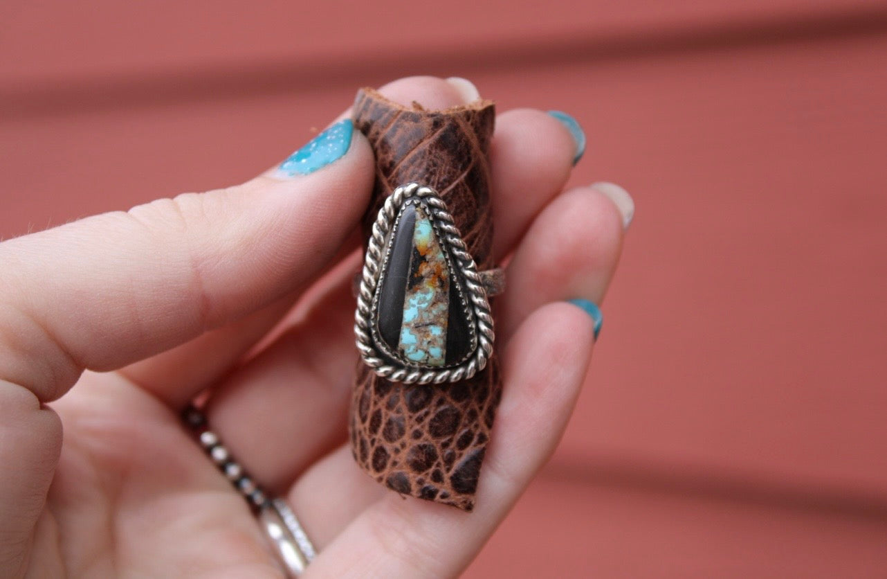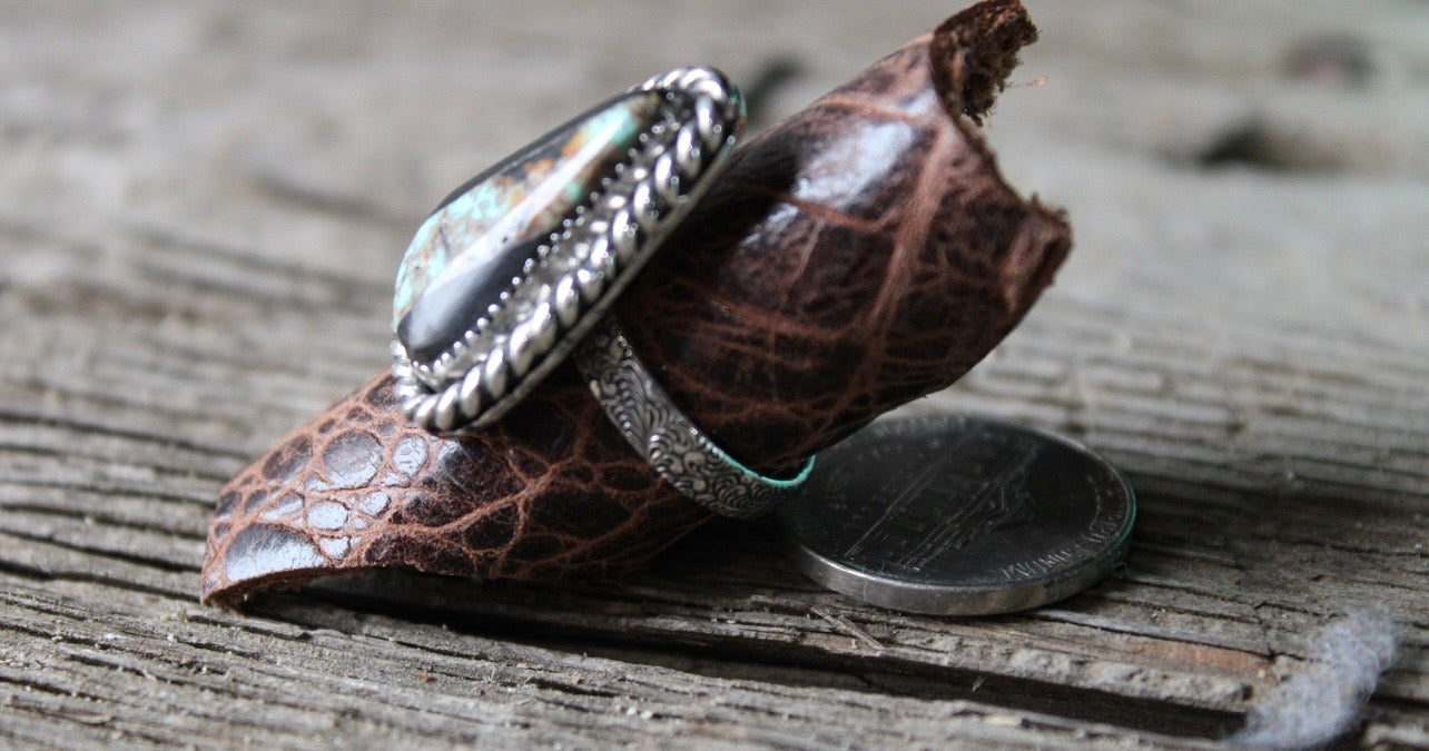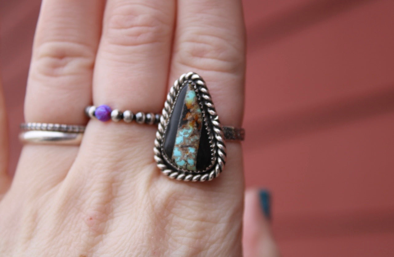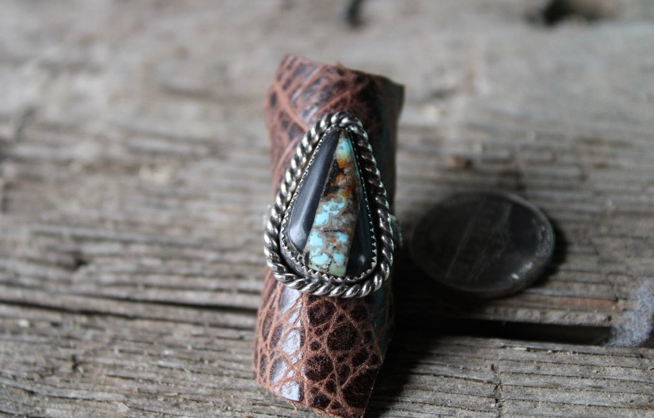 This is a Blackjack Turquoise stone wrapped in a twist wire with an “engraved looking” band.