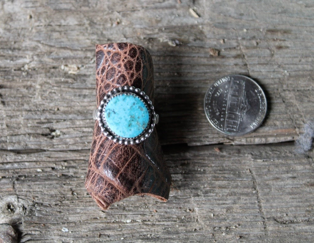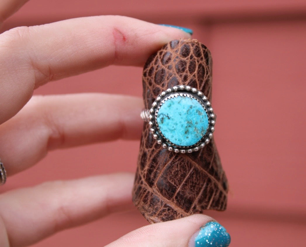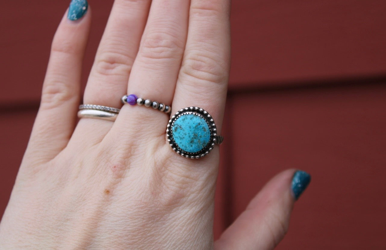 This is a beautiful round Kingman Turquoise ring set with a bead wire and detailed ring band